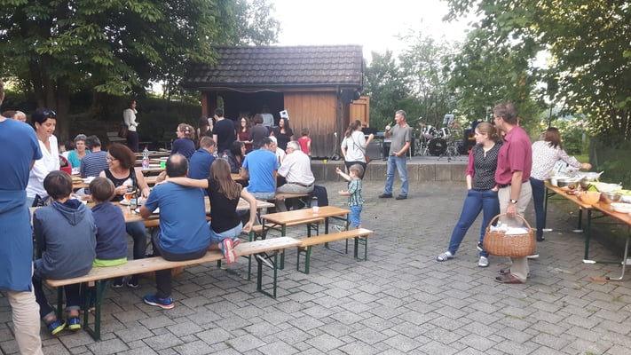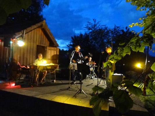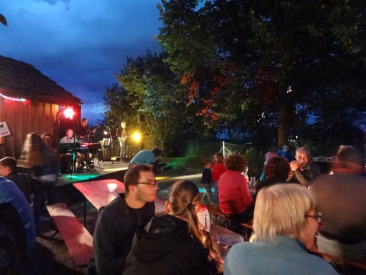 Heute, am 19. August 2017, wäre Openair angesagt - regelmässig konsultieren am Samstagmorgen viele Ackerbewohner das Regenradar. Hält das Wetter oder nicht? Das Aufstellen der Festbänke wird noch etwas nach hinten geschoben. Um 16:00 Uhr entscheidet Didi Fischer: „Volles Risiko. Wir spielen ohne Zelt für die Band“. Schnell wird die Piazza in Openair-Modus versetzt. Die kleine Bühne wird mit Instrumenten bestückt, das kleine Haus als Bar eingerichtet und der Platz mit Bänken gefüllt.